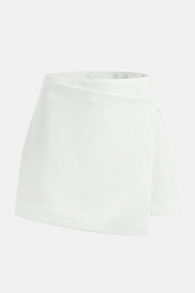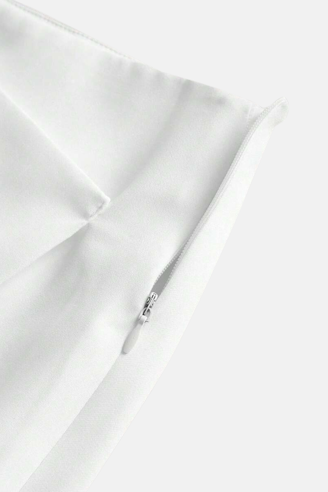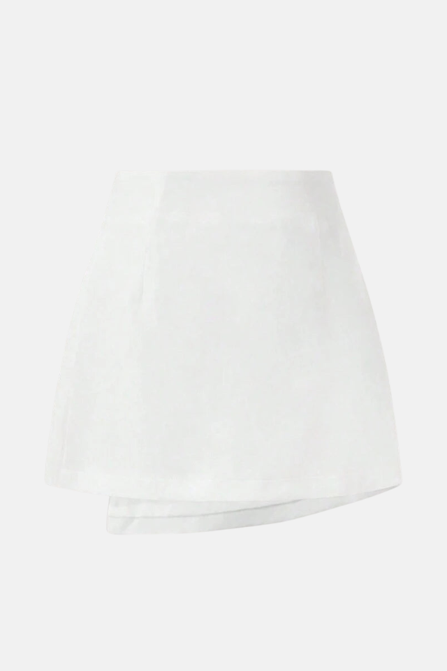 Saia curta de cintura alta. Fecho lateral com zíper discreto.