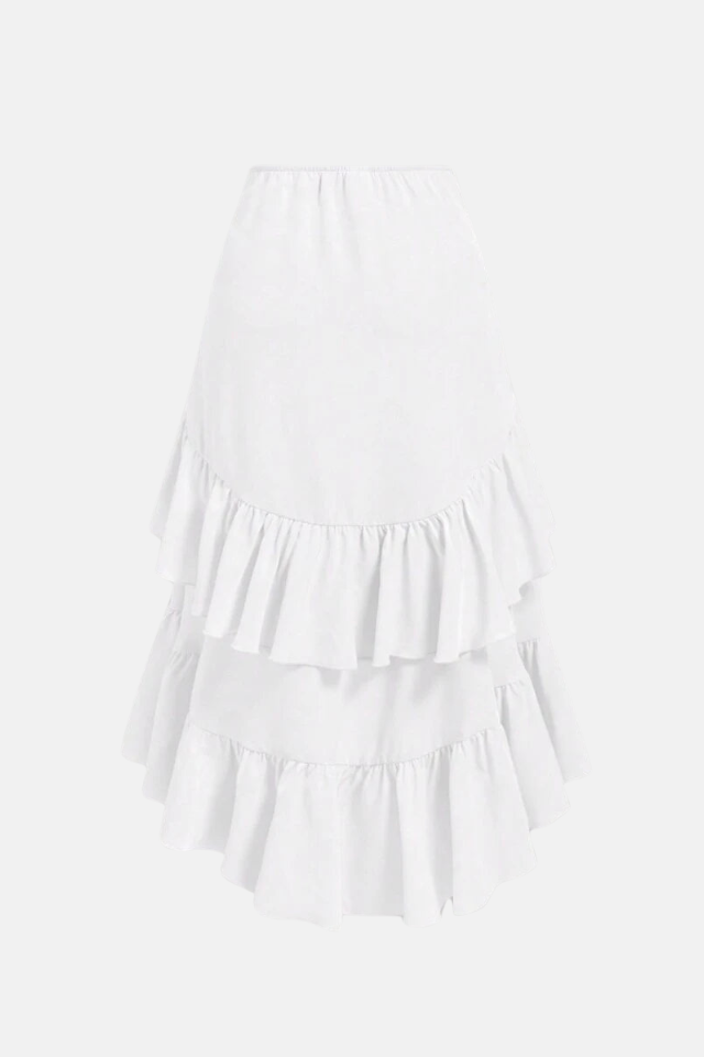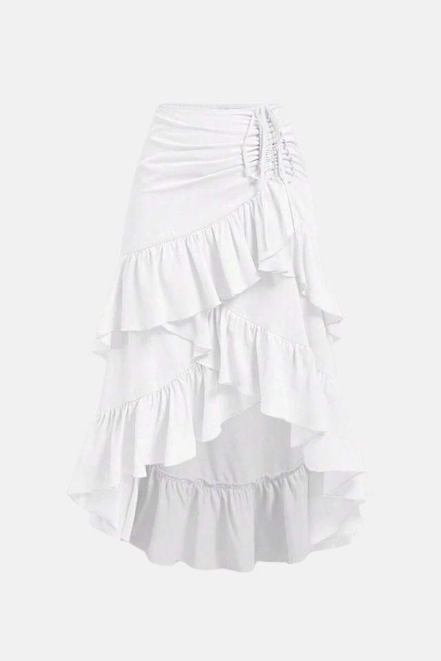 Saia longa ajustável na cintura. Detalhes com camadas sobrepostas de babado. Tecido fluido e acabamento leve.