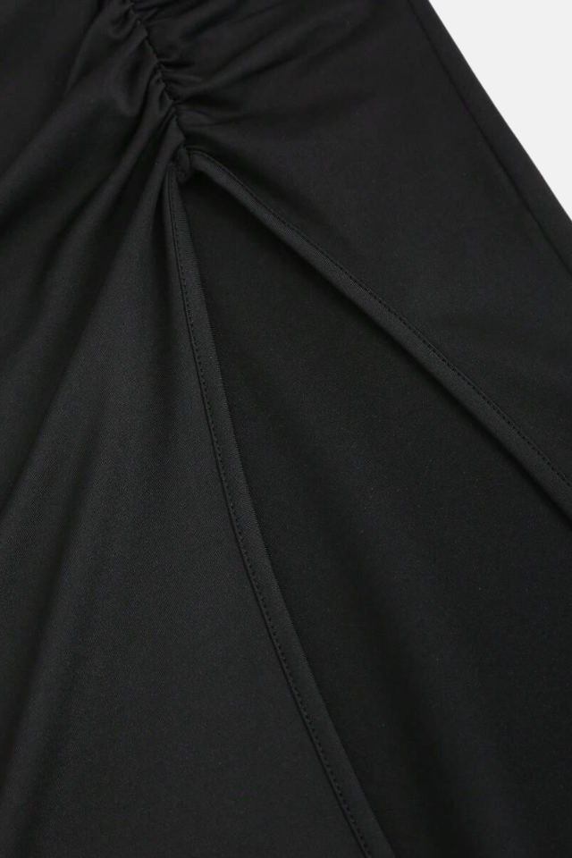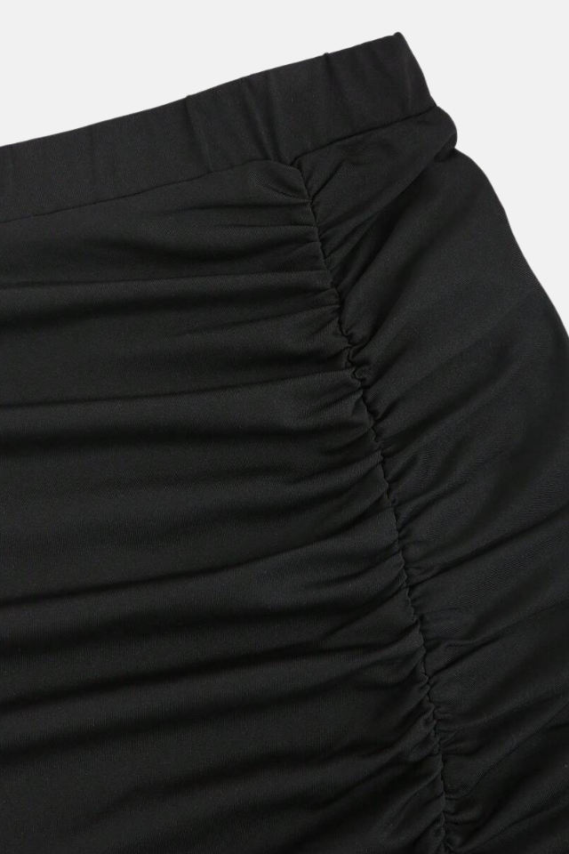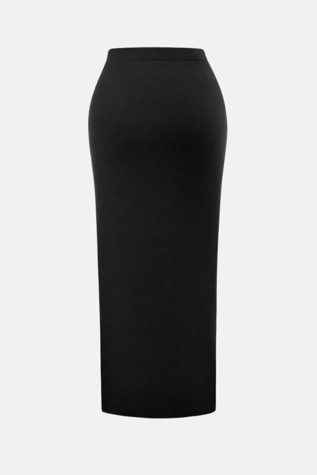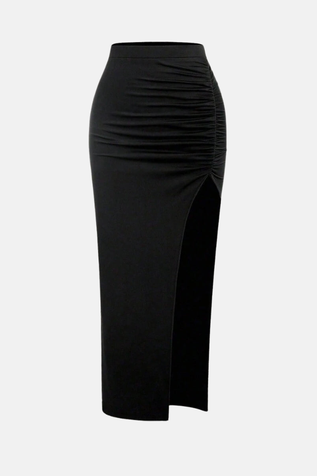 Saia longa de cintura alta ajustada ao corpo. Acabamento com drapeados delicados e fenda lateral.