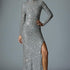 Vestido longo de manga longa inteiramente bordado em paetês prateados. Possui gola alta, modelagem ajustada e fenda lateral que traz sofisticação e sensualidade na medida certa. Ideal para ocasiões noturnas e eventos glamourosos.