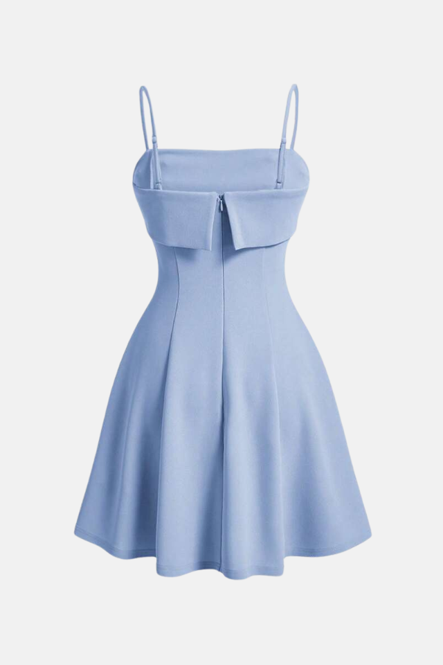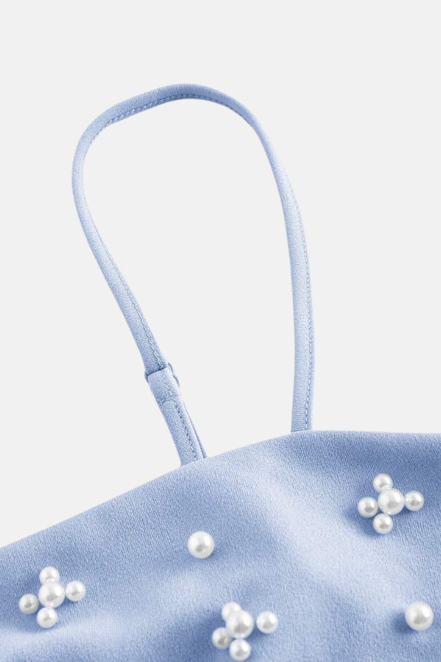 Vestido curto com alças finas e detalhes de pedraria no busto. Cintura marcada e fecho traseiro com zíper discreto.